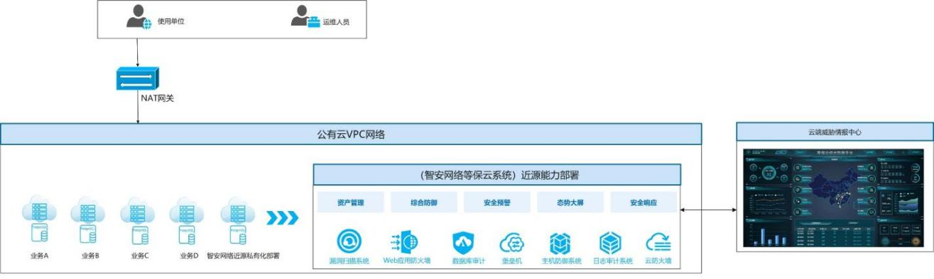 1.客户在其VPC网络提供资源,私有化近源部署等保云平台,保障其业务安全性,满足等保合规要求。