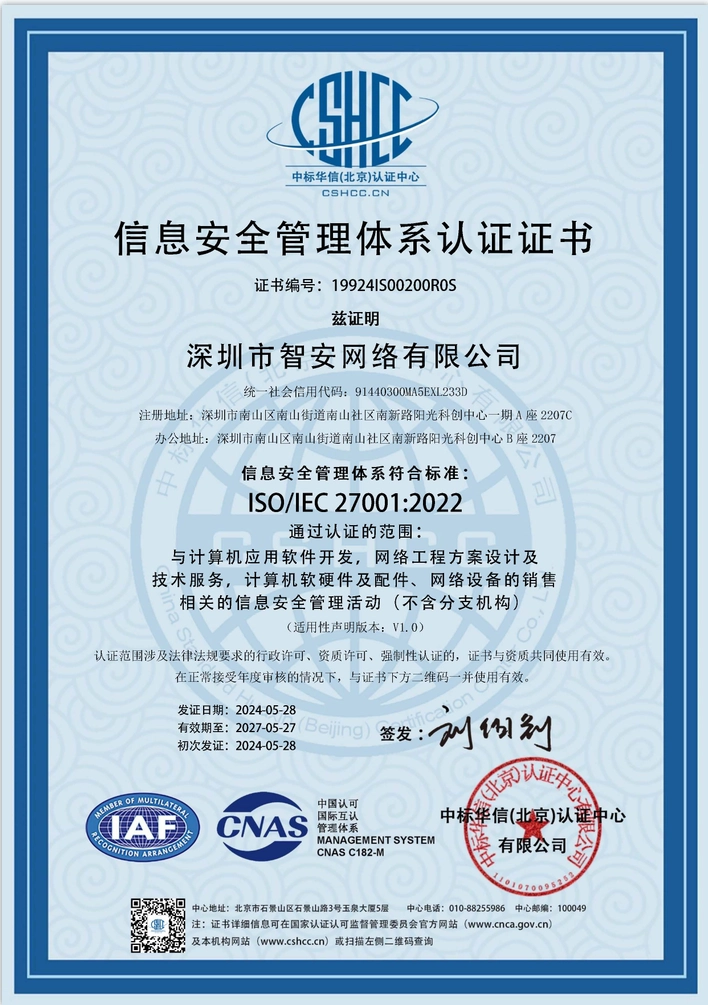 ISO27001是信息安全管理体系的标准,该标准基于风险评估,建立、实施、运行、监视、评审、保持和持续改进信息安全等一系列的管理活动。ISO27001管理体系主要针对信息安全中的系统漏洞、黑客入侵、病毒感染等内容进行保护,是全球应用最广泛与典型的信息安全管理标准。对于智安网络来说,这不仅仅是一个证书,也是信息安全管理的黄金标准。这一认证的获得需要企业在信息安全风险管理、政策、流程、培训和技术控制方面都达到极高的要求。简而言之,这是一项全球公认的、保证企业信息安全性和可靠性的权威认证。