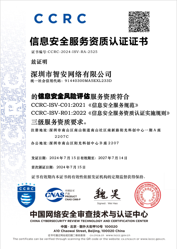 经中国网络安全审查技术与认证中心审核评估,深圳市智安网络有限公司成功获得了CCRC信息安全服务资质-风险评估三级资质,这标志着智安网络在信息安全风险评估、管理、处置等方面已达到了国家级的专业标准和服务质量!也意味着智安网络能够为客户提供更加安全、可靠的信息安全服务。