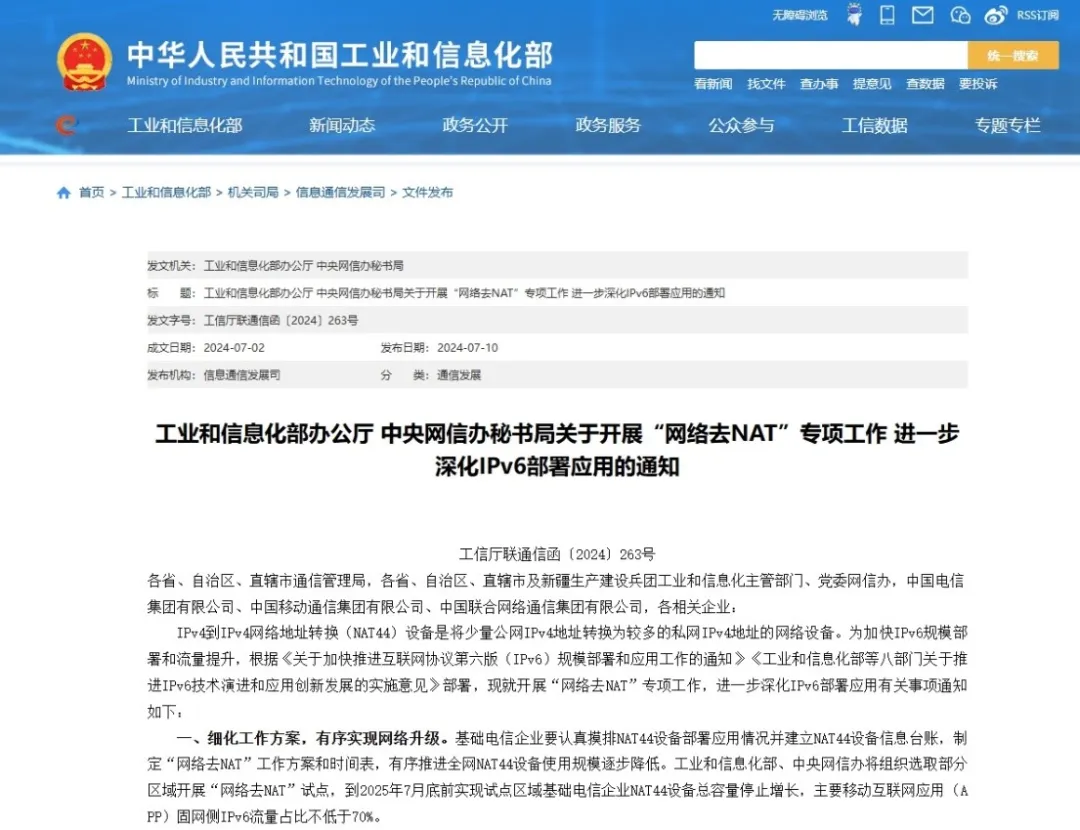 为向全社会释放我国加快向IPv6演进升级的明确信号,凝聚网络、应用、终端等产业各方合力,加速提升IPv6规模部署和应用水平,工业和信息化部、中央网信办近日联合印发通知,组织开展“网络去NAT”专项工作,进一步深化IPv6部署应用。主要包括五方面工作任务:细化工作方案,有序实现网络升级;紧抓关键环节,持续拓宽IPv6通路;深化应用改造,主动引导流量迁移;强化运行维护,确保网络安全稳定;加强督促评测,促进工作实效落地。