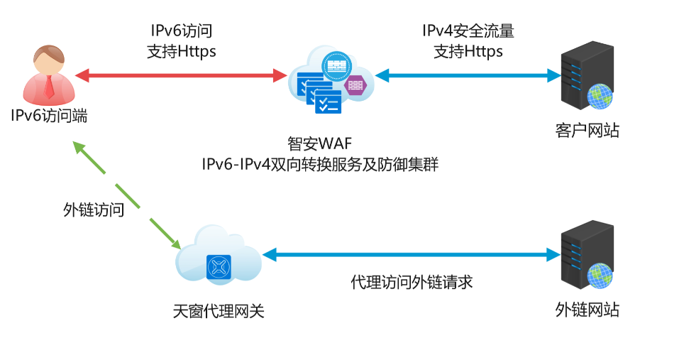 IPv6网络与IPv4网络是无法互通的,当业务系统自身支持IPv6访问,但业务系统所包含的其他外部链接不支持IPv6时就会出现天窗问题,天窗问题会导致访问失败、服务不可用,智安网络IPv6方案通过使用“天窗代理网关”代理访问外链,无需任何操作即可解决天窗问题。