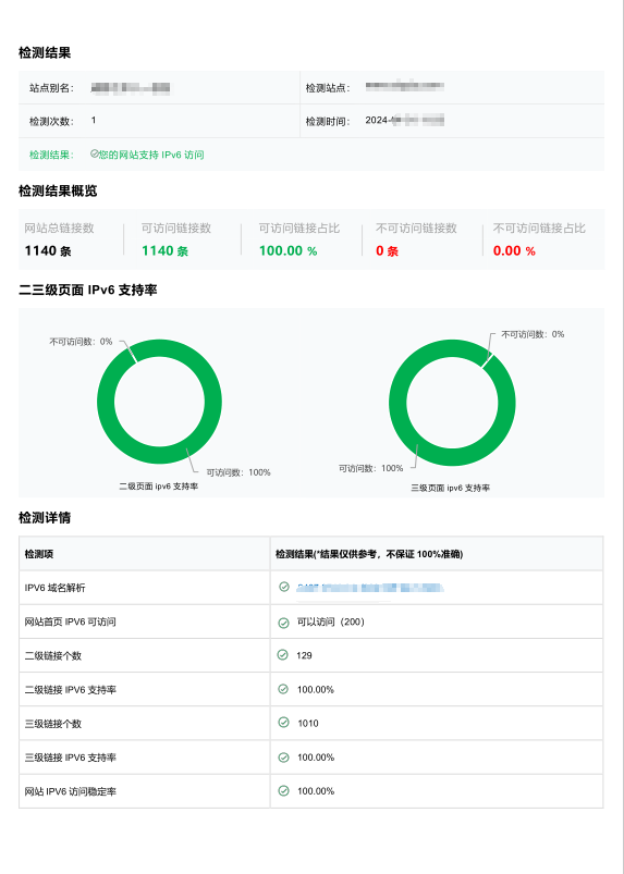 智安网络IPv6方案提供了业务系统改造后的IPv6合规检测服务,该服务遵循国家IPv6发展监测平台检测标准及通信行业标准YD/T3118-2016《网站 IPv6 支持度评测指标与测试方法》。通过全面监测评估改造后的IPv6网络,生成详细的检测报告,该报告展示了包括域名解析系统、网络连通性、二三级链接IPv6支持率以及首页内容/布局IPv6和IPv4的一致性等关键指标的检测结果,为客户提供全面、准确的业务系统IPv6支持度评估。